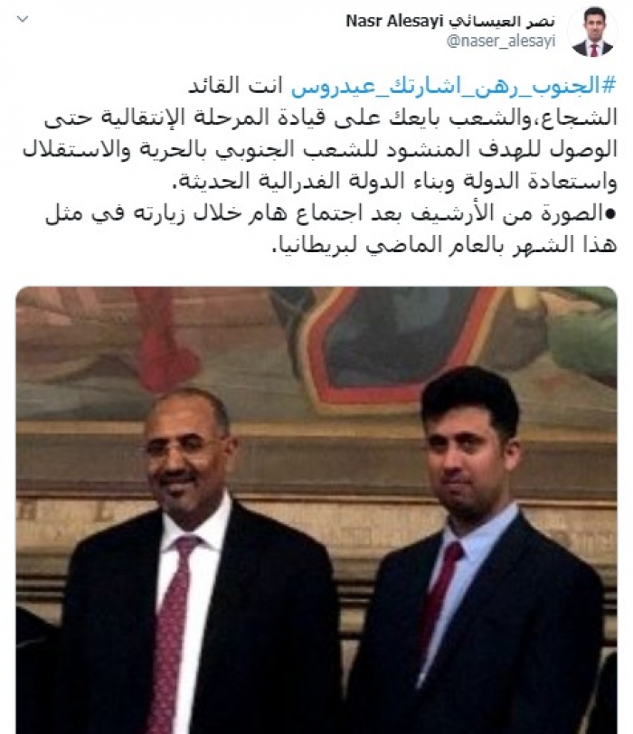 وأضاف "العيسائي" معلقاً على صورة جمعته بالقائد عيدروس الزبيدي: "الصورة من الأرشيف بعد اجتماع هام خلال زيارته في مثل هذا الشهر بالعام الماضي لبريطانيا".