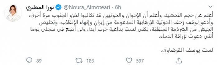 وكتبت في تغريدة عبر "تويتر" رصدها "المشهد العربي": "أعلم عن حجم التحشيد، وأعلم أن الإخوان والحوثيين قد تكالبوا لغزو الجنوب مرة أخرى، وأدعو لوقف زحف الحوثية الإرهابية المدعومة من إيران وإنهاء الإنقلاب، وتخليص الجيش من الشرذمة المنفلتة".