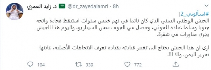 أكد الخبير الأمني السعودي اللواء ركن الدكتور زايد العمري، اليوم، أن ما يسمى بالجيش الوطني التابع لحكومة الشرعية يحتاج لتغيير قياداته، وذلك ليتحرر اليمن من مليشيات الحوثي.