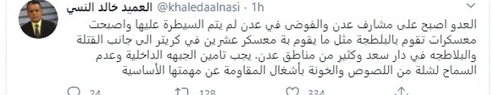 طالب الكاتب والمحلل العسكري العميد خالد النسي، اليوم، بتأمين الجبهة الداخلية في الجنوب وذلك بعد عدم السيطرة على الفوضى بالعاصمة عدن، مؤكدًا أن العدو أصبح على مشارف العاصمة عدن.