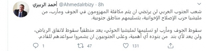 وقال في تغريدة عبر "تويتر" رصدها "المشهد العربي": "شعب الجنوب العربي لن يرتضي أن يتم مكافئة المهزومون في الجوف ومأرب، من مليشيا حزب الإصلاح الإخوانية، بتسليمهم مناطق جنوبية".