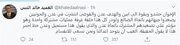 كشف الكاتب والمحلل العسكري العميد خالد النسي، اليوم، دليل تحالف الإخوان ومليشيات الحوثي للتصعيد في الجنوب.