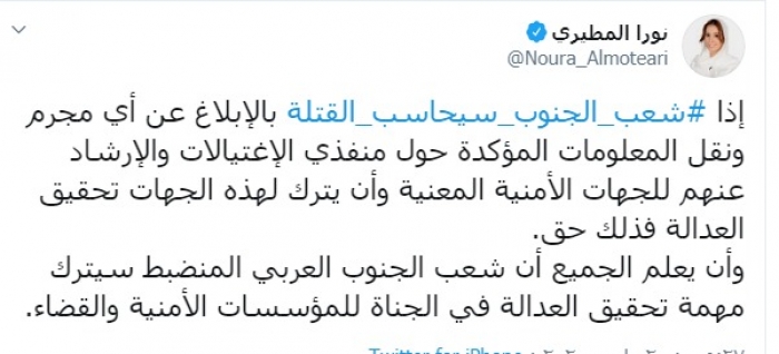 وكتبت المطيري عبر تغريدة لها على "تويتر" رصدها "المشهد العربي":"إذا شعب الجنوب سيحاسب القتلة بالإبلاغ عن أي مجرم ونقل المعلومات المؤكدة حول منفذي الاغتيالات والإرشاد عنهم للجهات الأمنية المعنية وأن يترك لهذه الجهات تحقيق العدالة فذلك حق".