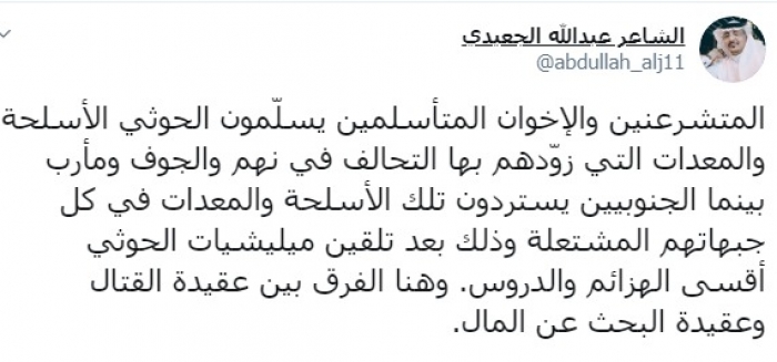 وكتب الجعيدي عبر تغريدة له على "تويتر" رصدها "المشهد العربي":"المتشرعنين والإخوان المتأسلمين يسلّمون الحوثي الأسلحة والمعدات التي زوّدهم بها التحالف في نهم والجوف ومأرب".