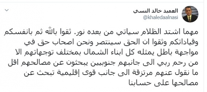 وكتب النسي عبر تغريدة له على "تويتر" رصدها "المشهد العربي":"مهما اشتد الظلام سيأتي من بعده نور، ثقوا بالله ثم بأنفسكم وقياداتكم وثقوا أن الحق سينتصر".