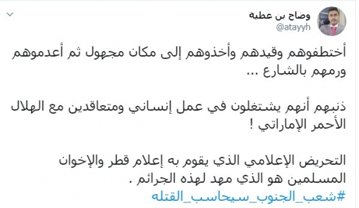 حمل الكاتب الصحفي وضاح بن عطية، اليوم، مليشيا الإخوان وإعلام قطر، مسؤولية اغتيال موظفي الهلال الأحمر الإماراتي في العاصمة عدن.