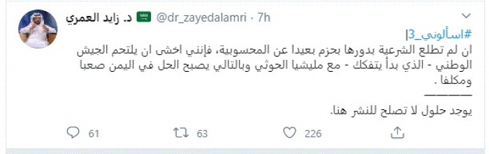 وقال في تغريدة عبر "تويتر" رصدها "المشهد العربي": "إن لم تطلع الشرعية بدورها بحزم بعيدًا عن المحسوبية، فإنني أخشى أن يلتحم الجيش الوطني - الذي بدأ يتفكك- مع مليشيا الحوثي وبالتالي يصبح الحل في اليمن صعبا ومكلفا. يوجد حلول لا تصلح للنشر هنا".