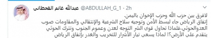 وكتب في تغريدة عبر "تويتر" رصدها "المشهد العربي": "لا فرق بين حزب الله وحزب الإخوان باليمن. اتفاق الرياض جاء لبسط الأمن وتوجيه سلاح الشرعية والانتقالي والمقاومات صوب العدوالحوثي".