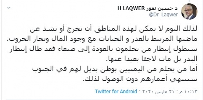 واختتم تغريدته قائلاً: "أما من يحلم من اليمنيين بوطن بديل لهم في الجنوب ستنتهي أعمارهم دون الوصول لذلك".