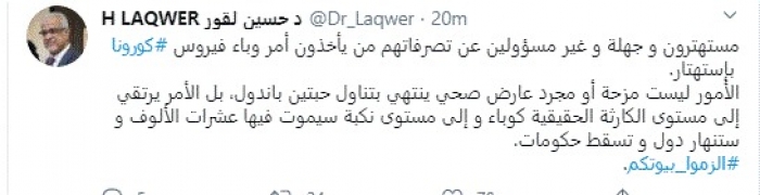 وكتب في تغريدة عبر "تويتر" رصدها "المشهد العربي": "مستهترون وجهلة وغير مسؤولين عن تصرفاتهم من يأخذون أمر وباء فيروس كورونا باستهتار".