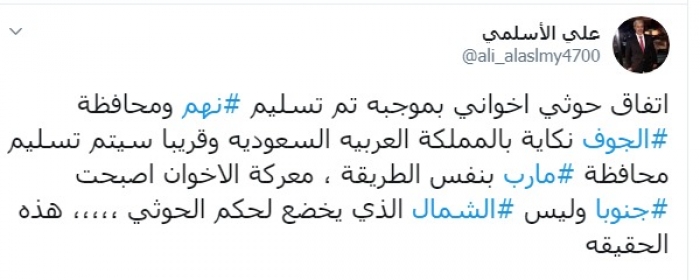 وكتب الأسلمي عبر تغريدة له على "تويتر" رصدها" المشهد العربي":"اتفاق حوثي إخواني بموجبه تم تسليم نهم ومحافظة الجوف نكاية بالمملكة العربية السعودية وقريبا سيتم تسليم محافظة مأرب بنفس الطريقة".
