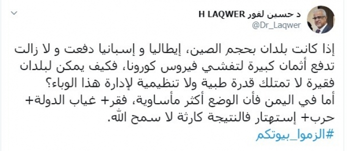 وأضاف:"أما في اليمن فأن الوضع أكثر مأساوية، فقر+ غياب الدولة + حرب + استهتار فالنتيجة كارثة لا سمح الله.".