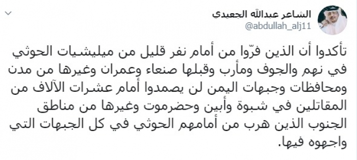 وكتب الجعيدي عبر تغريدة له على "تويتر" رصدها "المشهد العربي":"تأكدوا أن الذين فرّوا من أمام نفر قليل من ميليشيات الحوثي في نهم والجوف ومأرب وقبلها صنعاء وعمران وغيرها من مدن ومحافظات وجبهات اليمن لن يصمدوا أمام عشرات الآلاف من المقاتلين في شبوة وأبين وحضرموت وغيرها من مناطق الجنوب الذين هرب من أمامهم الحوثي في كل الجبهات التي واجهوه فيها"..