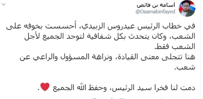 وكتب بن فائض عبر تغريدة له على "تويتر" رصدها" المشهد العربي":" في خطاب الرئيس عيدروس الزبيدي، أحسست بخوفه على الشعب، وكان يتحدث بكل شفافية لتوحد الجميع لأجل الشعب فقط".
