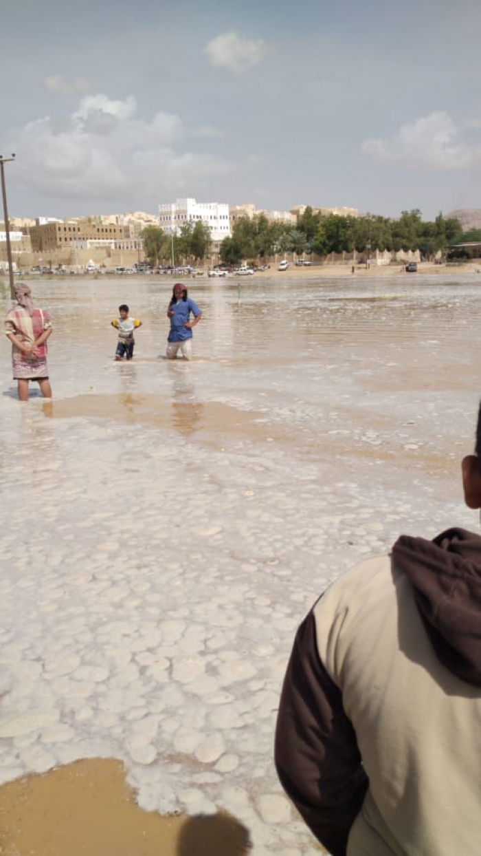 وغمرت مياه السيول القادمة من وادي سر الجسور الأرضية في منطقة العقاد بين مديريتي شبام والقطن.