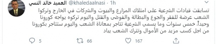 وقال في تغريدة عبر "تويتر" رصدها "المشهد العربي": "تسابقت قيادات الشرعية على امتلاك المزارع والبيوت والشركات في الخارج وتركوا الشعب عرضة للفقر والجوع والبطالة والفوضى والقتل واليوم تركوه يواجه كورونا وحيداً".
