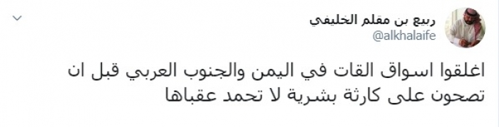 وكتب الخليفي عبر تغريدة له على "تويتر" رصدها "المشهد العربي":"أغلقوا أسواق القات في اليمن والجنوب العربي قبل أن تصحون على كارثة بشرية لا تحمد عقباها".
