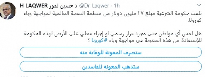 وكتب في تغريدة عبر "تويتر" رصدها "المشهد العربي": "تلقت حكومة الشرعية مبلغ 27 مليون دولار من منظمة الصحة العالمية لمواجهة وباء كورونا. هل لمس أي مواطن حتى مجرد قرار رسمي أو إجراء فعلي على الأرض لهذه الحكومة للاستفادة من هذه المعونة في مواجهة وباء كورونا؟".