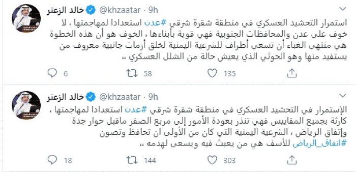وكتب في تغريدات عبر "تويتر" رصدها "المشهد العربي": "الاستمرار في التحشيد العسكري في منطقة شقرة شرقي عدن استعدادا لمهاجمتها، كارثة بجميع المقاييس فهي تنذر بعودة الأمور إلى مربع الصفر ما قبل حوار جدة واتفاق الرياض، الشرعية اليمنية التي كان من الأولى أن تحافظ وتصون اتفاق الرياض للأسف هي من يعبث فيه ويسعى لهدمه".
