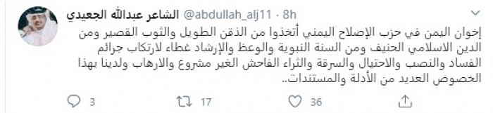 وقال في تغريدة عبر "تويتر" رصدها "المشهد العربي": "إخوان اليمن في حزب الإصلاح اليمني اتخذوا من الذقن الطويل والثوب القصير ومن الدين الإسلامي الحنيف ومن السنة النبوية والوعظ والإرشاد غطاء لارتكاب جرائم الفساد والنصب والاحتيال والسرقة والثراء الفاحش الغير مشروع والإرهاب ولدينا بهذا الخصوص العديد من الأدلة والمستندات".