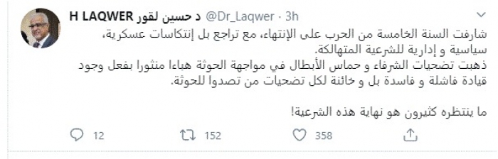 وكتب في تغريدة عبر "تويتر" رصدها "المشهد العربي": "شارفت السنة الخامسة من الحرب على الانتهاء، مع تراجع بل انتكاسات عسكرية، سياسية وإدارية للشرعية المتهالكة".