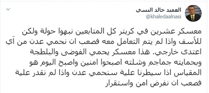وكتب النسي عبر تغريدة له على "تويتر" رصدها " المشهد العربي":"معسكر عشرين في كريتر كل المتابعين نبهوا حوله ولكن للأسف، وإذا لم يتم التعامل معه فصعب أن نحمي عدن من إي اعتدى خارجي".