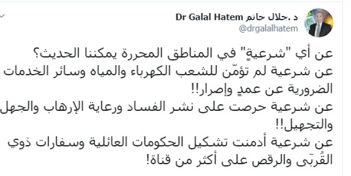 وكتب حاتم عبر تغريدة له على "تويتر" رصدها " المشهد العربي":"عن أي شرعية في المناطق المحررة يمكننا الحديث؟، عن شرعية لم تؤمّن للشعب الكهرباء والمياه وسائر الخدمات الضرورية عن عمدٍ وإصرار!!".