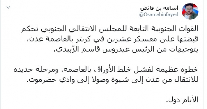 وكتب بن فائض عبر تغريدة له على "تويتر" رصدها " المشهد العربي":"القوات الجنوبية التابعة للمجلس الانتقالي الجنوبي تحكم قبضتها على معسكر عشرين في كريتر بالعاصمة عدن، بتوجيهات من الرئيس عيدروس قاسم الزُبيدي".
