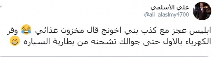 وكتب الأسلمي عبر تغريدة له على "تويتر" رصدها " المشهد العربي":"إبليس عجز مع كذب بني اخونج، قال مخزون غذائي، وفر الكهرباء بالأول حتى جوالك تشحنه من بطارية السيارة".