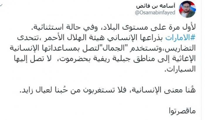 وكتب بن فائض عبر تغريدة له على "تويتر " رصدها " المشهد العربي":"لأول مرة على مستوى البلاد، وفي حالة استثنائية، الإمارات بذراعها الإنساني هيئة الهلال الأحمر ،تتحدى التضاريس،وتستخدم "الجمال"لتصل بمساعداتها الإنسانية الإغاثية إلى مناطق جبلية ريفية بحضرموت، لا تصل إليها السيارات".