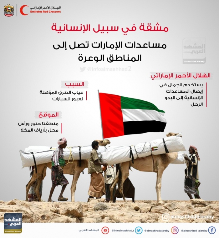 في لفتة تُبرهن على الدور الإنساني للإمارات في المناطق المحررة، لجأت هيئة الهلال الأحمر الإماراتي للجمال من أجل توصيل المساعدات إلى البدو الرحل.