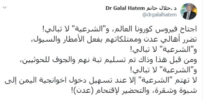 وكتب حاتم عبر تغريدة له على " تويتر" رصدها " المشهد العربي":"اجتاح فيروس كورونا العالم، و"الشرعية" لا تبالي، تضرر أهالي عدن وممتلكاتهم بفعل الأمطار والسيول، و"الشرعية" لا تبالي".
