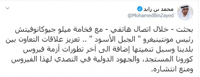 وكتب بن زايد عبر تغريدة له على "تويتر" رصدها " المشهد العربي":" بحثت - خلال اتصال هاتفي - مع فخامة ميلو جيوكانوفيتش رئيس مونتينيغرو " الجبل الأسود "تعزيز علاقات التعاون بين بلدينا وسبل تنميتها".