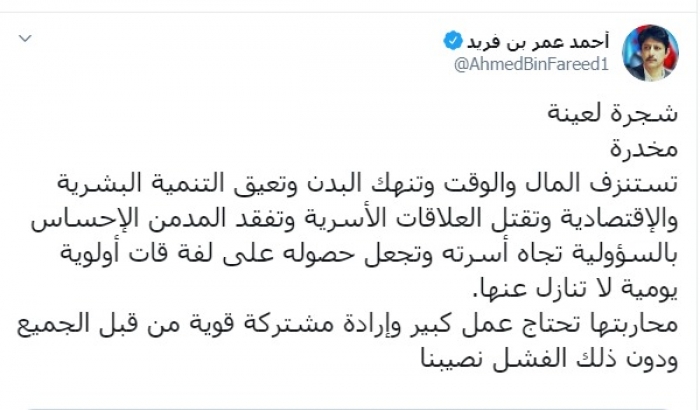 وكتب بن فريد عبر تغريدة له على " تويتر" رصدها " المشهد العربي":"شجرة لعينة، مخدرة، تستنزف المال والوقت وتنهك البدن وتعيق التنمية البشرية والاقتصادية وتقتل العلاقات الأسرية وتفقد المدمن الإحساس بالمسؤولية تجاه أسرته وتجعل حصوله على لفة قات أولوية يومية لا تنازل عنها".