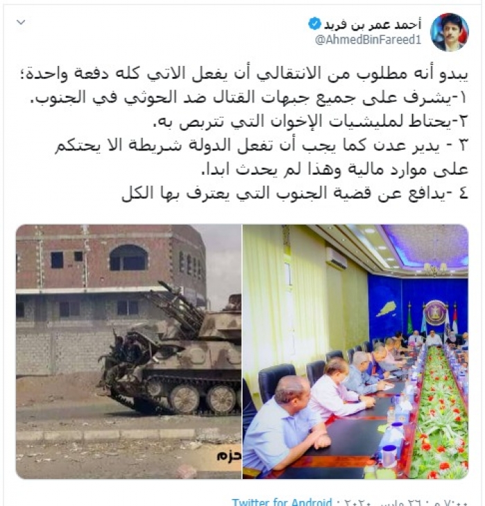 وكتب "بن فريد" في تغريدة عبر حسابه بتويتر، رصدها "المشهد العربي" قال فيها: "يبدو أنه مطلوب من الانتقالي أن يفعل الأتي كله دفعة واحدة: