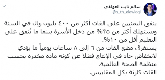 وكتب العولقي عبر تغريدة له على "تويتر" رصدها " المشهد العربي" :" ينفق اليمنيون على القات أكثر من 400 بليون ريال في السنة، ويستهلك أكثر من 35 % من دخل الأسرة بينما ما يُنفق على التعليم أقل من 10 % ".