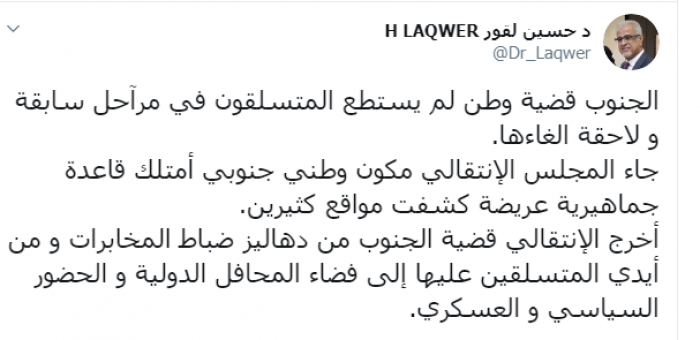 وكتب لقور عبر تغريدة له على "تويتر" رصدها " المشهد العربي":"الجنوب قضية وطن لم يستطع المتسلقون في مراحل سابقة و لاحقة إلغاءها".