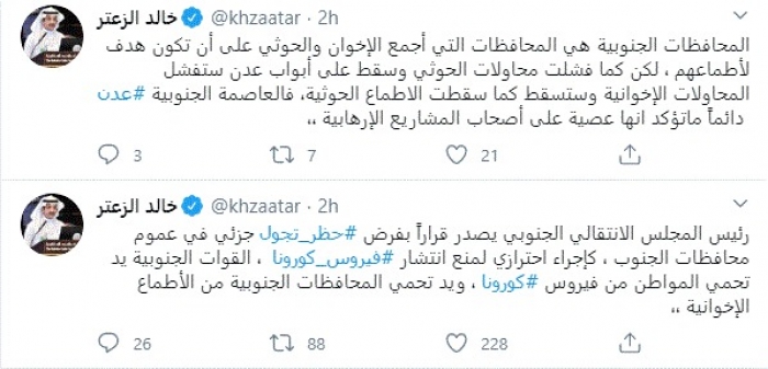 وقال في تغريدات عبر "تويتر" رصدها "المشهد العربي": "رئيس المجلس الانتقالي الجنوبي يصدر قراراً بفرض حظر تجول جزئي في عموم محافظات الجنوب، كإجراء احترازي لمنع انتشار فيروس كورونا، القوات الجنوبية يد تحمي المواطن من فيروس كورونا ، ويد تحمي المحافظات الجنوبية من الأطماع الإخوانية".