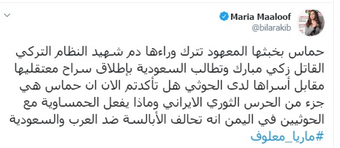 وكتبت معلوف عبر تغريدة له على "تويتر" رصدها " المشهد العربي":"حماس بخبثها المعهود تترك وراءها دم شهيد النظام التركي القاتل زكي مبارك وتطالب السعودية بإطلاق سراح معتقليها مقابل أسراها لدى الحوثي".