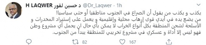 وقال في تغريدة عبر "تويتر" رصدها "المشهد العربي": "يكذب ويكذب من يقول أن الصراع في الجنوب مناطقيًا أو حتى سياسيًا. من يضع يده في أيدي قوى إرهاب محلية وإقليمية ويعمل على استيراد المخدرات والأسلحة لشحن المنطقة بكل أنواع الخراب لا يمكن بأي حال أن يحمل أي مشروع وطن فهو ليس إلا أداة وعسكري في مشروع تخريبي للمنطقة يبدأ من الجنوب".