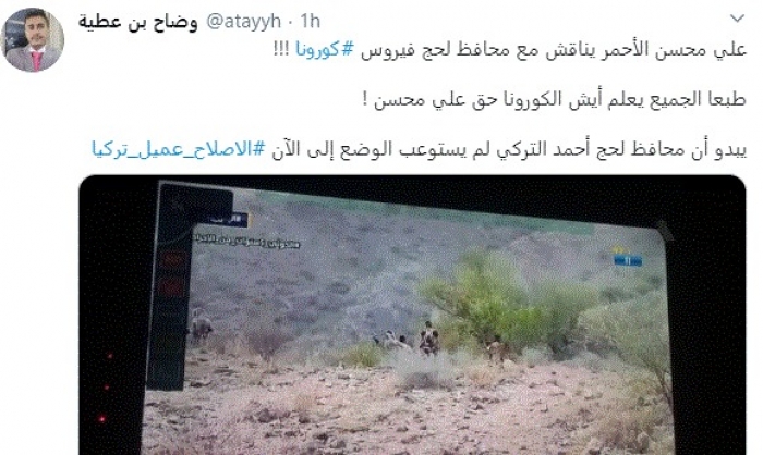 وقال في تغريدة عبر "تويتر" رصدها "المشهد العربي": "علي محسن الأحمر يناقش مع محافظ لحج فيروس كورونا طبعا الجميع يعلم ايش الكورونا حق علي محسن. يبدو أن محافظ لحج أحمد التركي لم يستوعب الوضع إلى الآن".