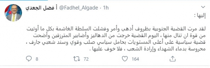 وكتب في تغريدة عبر "تويتر" رصدها "المشهد العربي": "لقد مرت القضية الجنوبية بظروف أدهى وأمر وفشلت السلطة الغاشمة بكل ما أوتيت من قوة أن تنال منها، اليوم القضية خرجت من الدهاليز وأضابير المترزقين وأضحت قضية سياسية على أعلى المستويات بحامل سياسي صلب وقوي وسند شعبي جارف، محروسة بدماء الشهداء وإرادة الشعب، فلا خوف عليها".