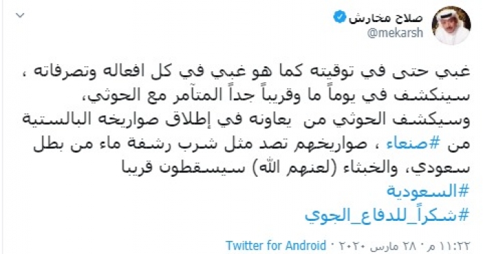وكتب "مخارش" في تغريدة عبر حسابه "تويتر" رصدها "المشهد العربي" قال فيها: "غبي حتى في توقيته كما هو غبي في كل أفعاله وتصرفاته ، سينكشف في يوماً ما وقريباً جداً المتآمر مع الحوثي، وسيكشف الحوثي من يعاونه في إطلاق صواريخه البالستية من صنعاء".