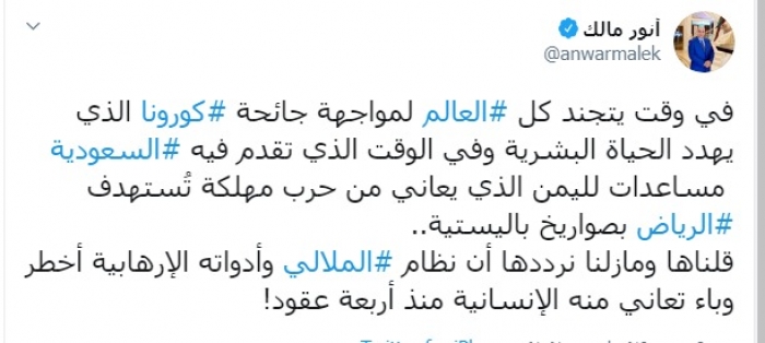 وكتب مالك عبر تغريدة له على "تويتر" رصدها " المشهد العربي":"في وقت يتجند كل العالم لمواجهة جائحة كورونا الذي يهدد الحياة البشرية، وفي الوقت الذي تقدم فيه السعودية مساعدات لليمن الذي يعاني من حرب مهلكة تُستهدف الرياض بصواريخ باليستية".