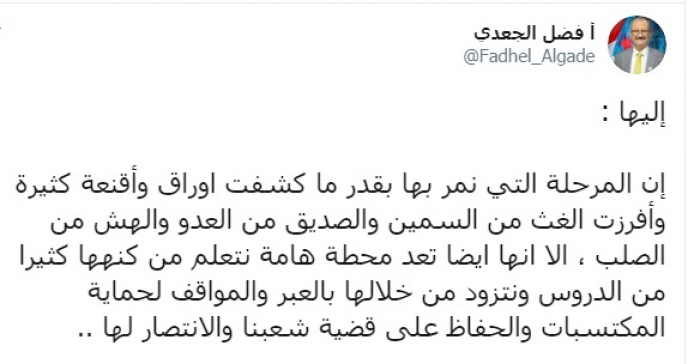وكتب الجعدي عبر تغريدة له على "تويتر" رصدها " المشهد العربي":"إن المرحلة التي نمر بها بقدر ما كشفت أوراق وأقنعة كثيرة وأفرزت الغث من السمين والصديق من العدو والهش من الصلب ، إلا أنها ايضا تعد محطة هامة نتعلم من كنهها كثيرا من الدروس ونتزود من خلالها بالعبر والمواقف لحماية المكتسبات والحفاظ على قضية شعبنا والانتصار لها".