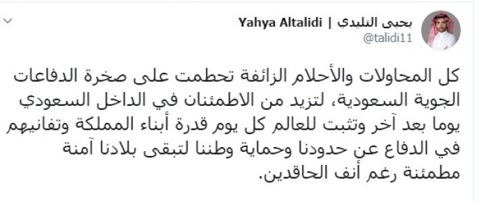وكتب التليدي عبر تغريدة له على "تويتر" رصدها " المشهد العربي":" كل المحاولات والأحلام الزائفة تحطمت على صخرة الدفاعات الجوية السعودية، لتزيد من الاطمئنان في الداخل السعودي".