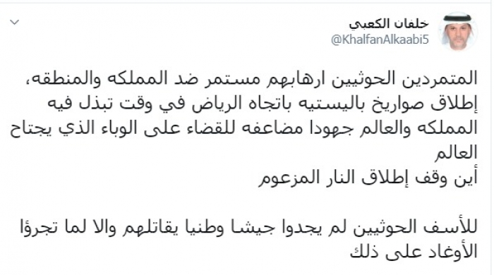 وكتب الكعبي عبر تغريدة له على "تويتر" رصدها " المشهد العربي":"المتمردون الحوثيون إرهابهم مستمر ضد المملكة والمنطقة، إطلاق صواريخ باليستية باتجاه الرياض في وقت تبذل فيه المملكة والعالم جهودا مضاعفة للقضاء على الوباء الذي يجتاح العالم، أين وقف إطلاق النار المزعوم".
