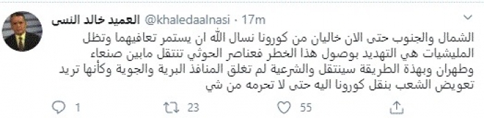 وكتب في تغريدة "تويتر" رصدها "المشهد العربي": "الشمال والجنوب حتى الآن خاليان من كورونا نسأل الله أن يستمر تعافيهما وتظل المليشيات هي التهديد بوصول هذا الخطر فعناصر الحوثي تنتقل مابين صنعاء وطهران وبهذه الطريقة سينتقل".