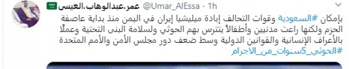 وكتب في تغريدة عبر "تويتر" رصدها "المشهد العربي": "بإمكان السعودية وقوات التحالف إبادة ميليشيا إيران في اليمن منذ بداية عاصفة الحزم ولكنها راعت مدنيين وأطفالاً يتترس بهم الحوثي ولسلامة البنى التحتية وعملًا بالأعراف الإنسانية والقوانين الدولية وسط ضعف دور مجلس الأمن والأمم المتحدة".