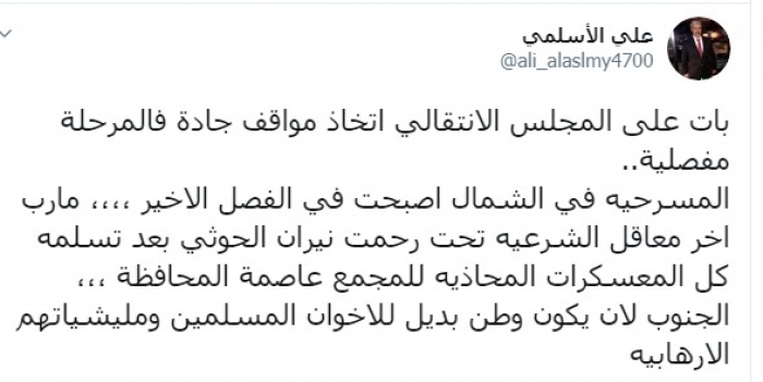وكتب الأسلمي عبر تغريدة له على "تويتر" رصدها " المشهد العربي":" بات على المجلس الانتقالي اتخاذ مواقف جادة فالمرحلة مفصلية".